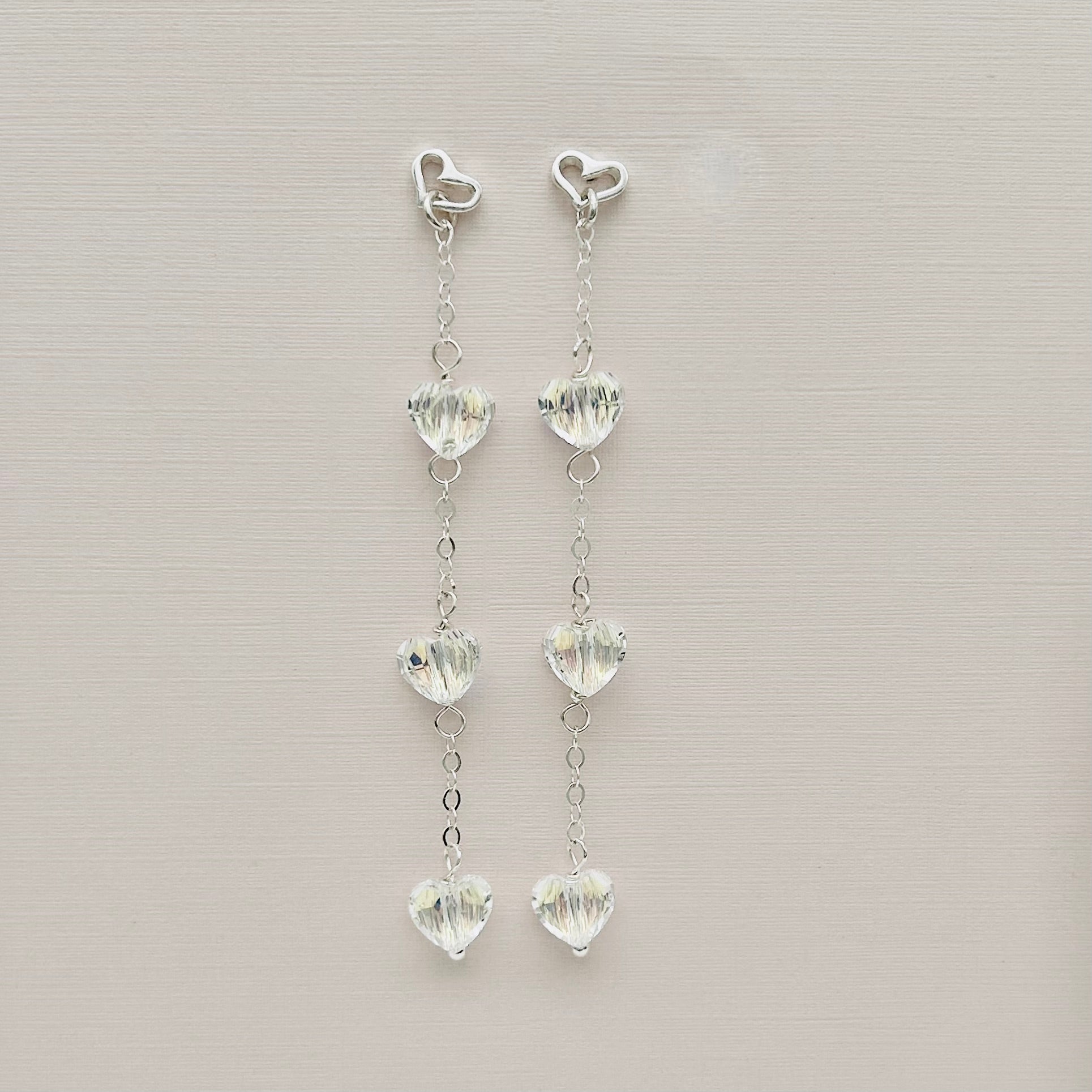 These elegant C1285ER Clear AB Hearts Earrings feature .925 sterling silver and sparkling Austrian Crystals. Made with high-quality materials, these earrings add a touch of sophistication to any outfit. At 3" long, they make a statement while still being lightweight and comfortable to wear. Perfect for a special occasion or everyday wear.