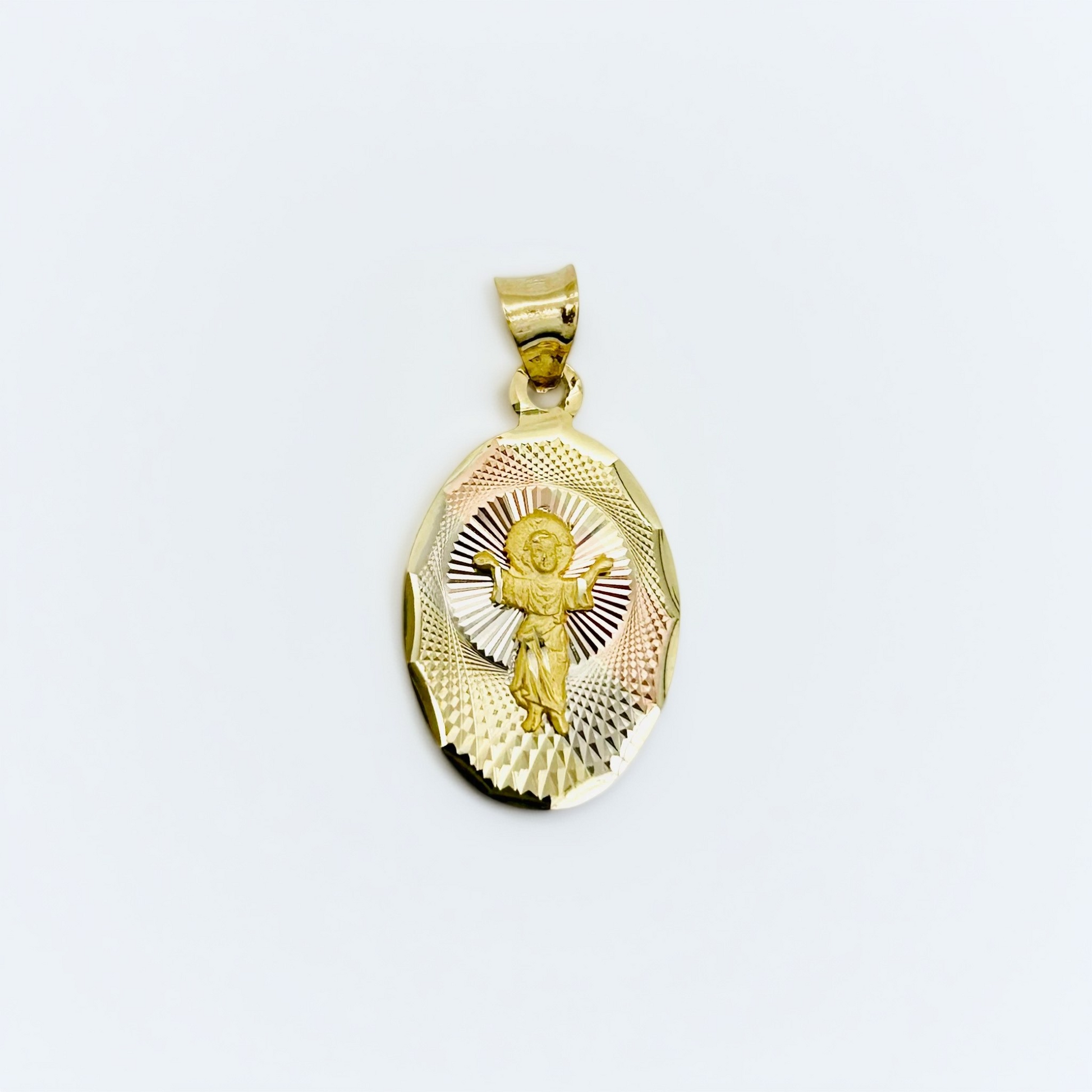 Crafted from 14k gold, the G428P Divino Niño pendant measures 25mm by 13mm, offering a refined and elegant design. This pendant combines timeless craftsmanship with a meaningful symbol, making it a distinguished accessory that complements both everyday wear and special occasions. Its durable gold composition ensures lasting beauty and value.