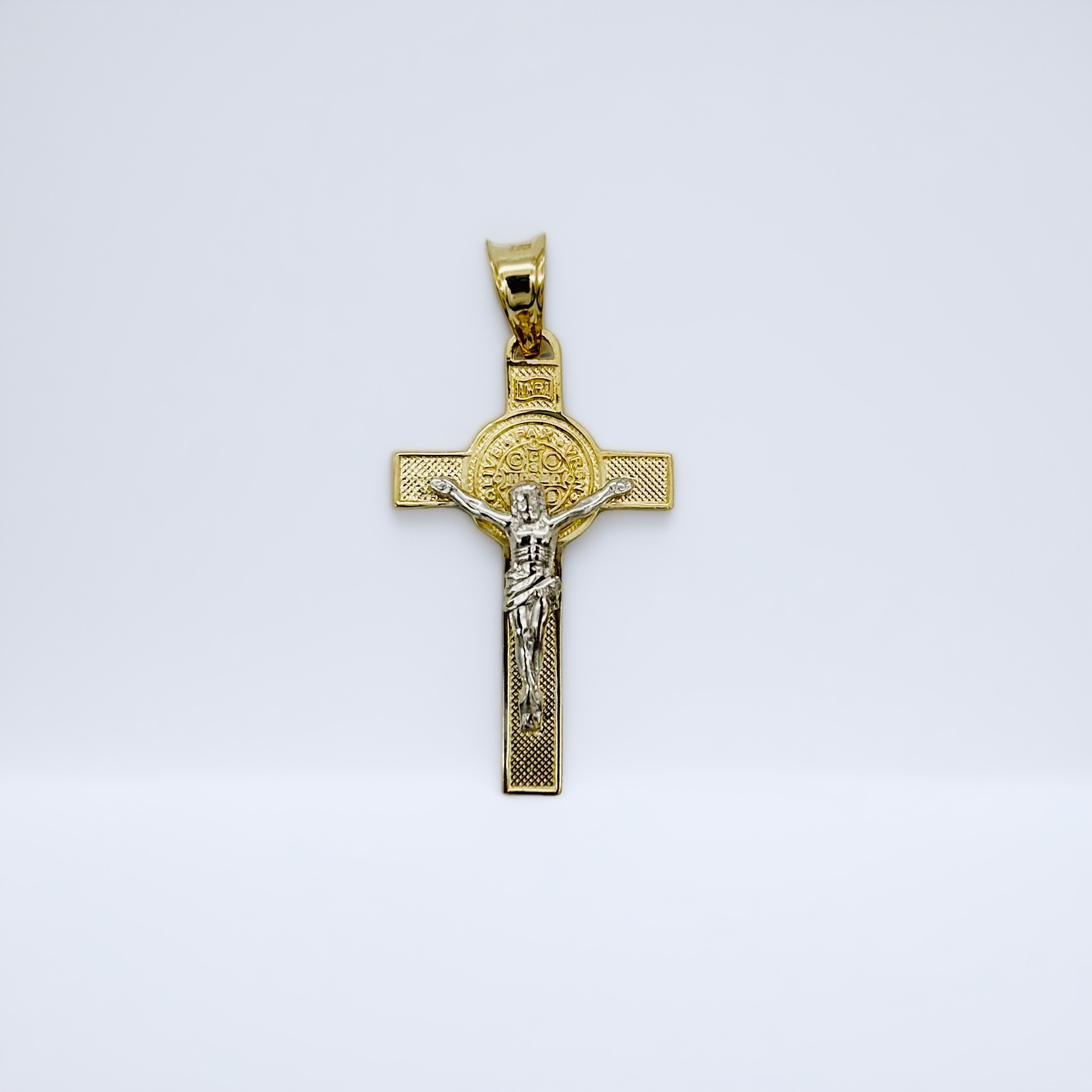 This 14K two-tone gold San Benito crucifix measures 35mm by 18mm, combining classic design with durable craftsmanship. Its dual gold tones enhance the intricate detailing, making it a distinguished piece suitable for both daily wear and special occasions. Expertly crafted, it offers a meaningful symbol of faith with lasting elegance.
