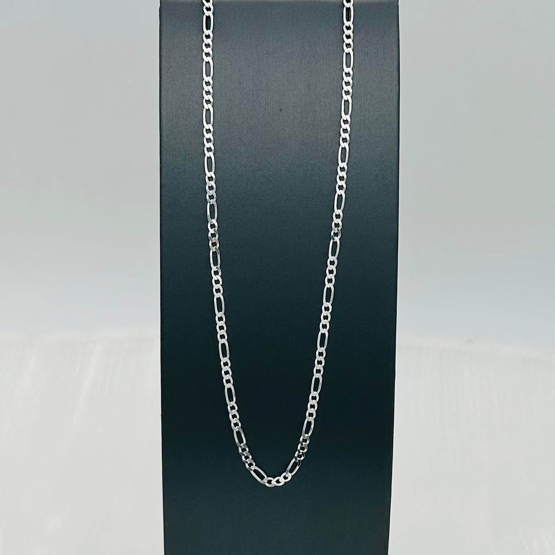 Timeless elegance meets everyday versatility with this sterling silver Figaro chain. Crafted from .925 sterling silver, this 3mm chain features the classic Figaro link pattern—alternating single and triple links—creating visual interest and durability. At 18 inches, it's the perfect length for layering or wearing solo. Whether you're showcasing a pendant or making a statement on its own, this chain combines traditional craftsmanship with modern style. An essential piece for any jewelry collection.