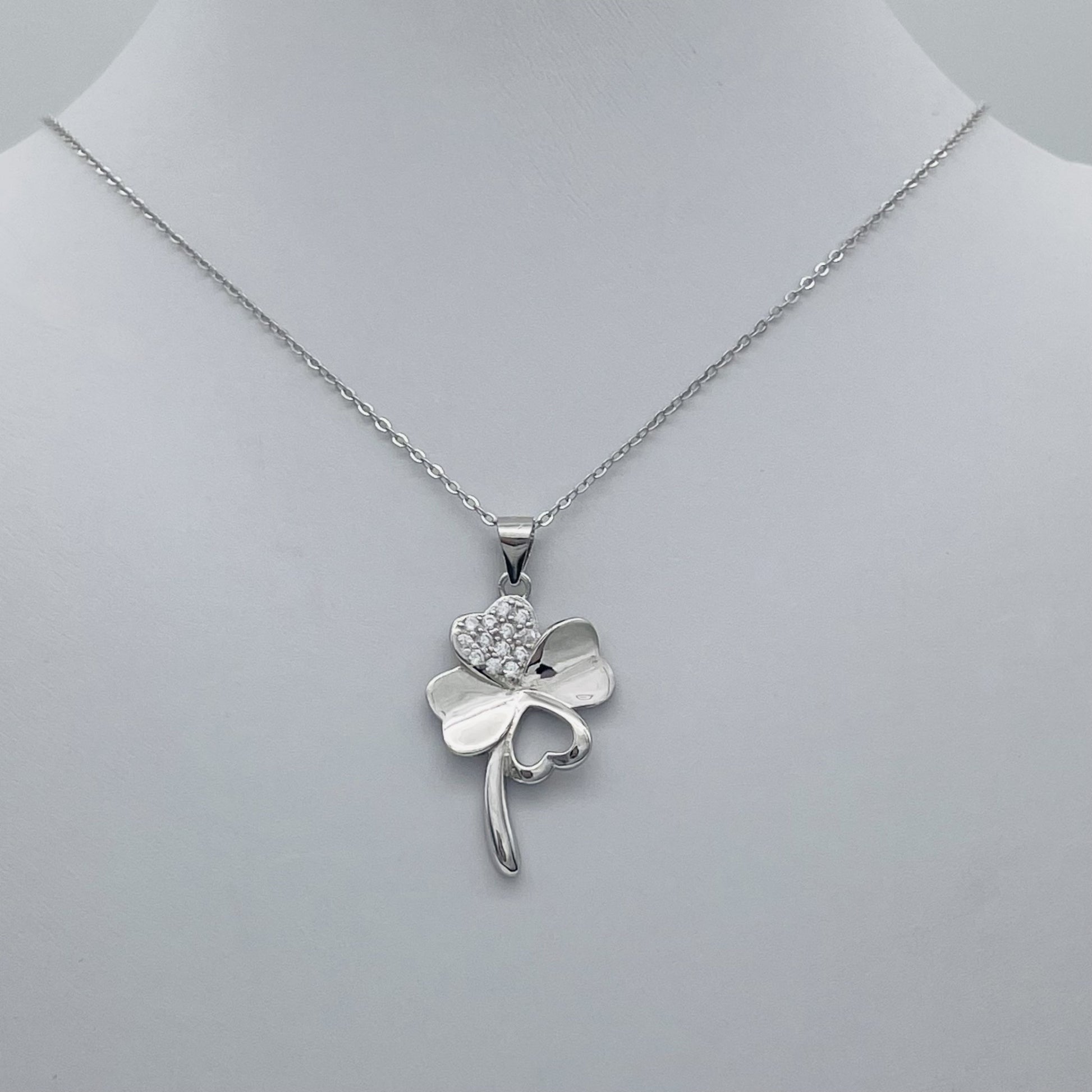 This genuine 925 sterling silver and cubic zirconia necklace features a delicate four-leaf clover design. With its high-quality materials, this necklace adds a touch of elegance and beauty to any outfit. Perfect for anyone looking for a unique and stylish accessory.