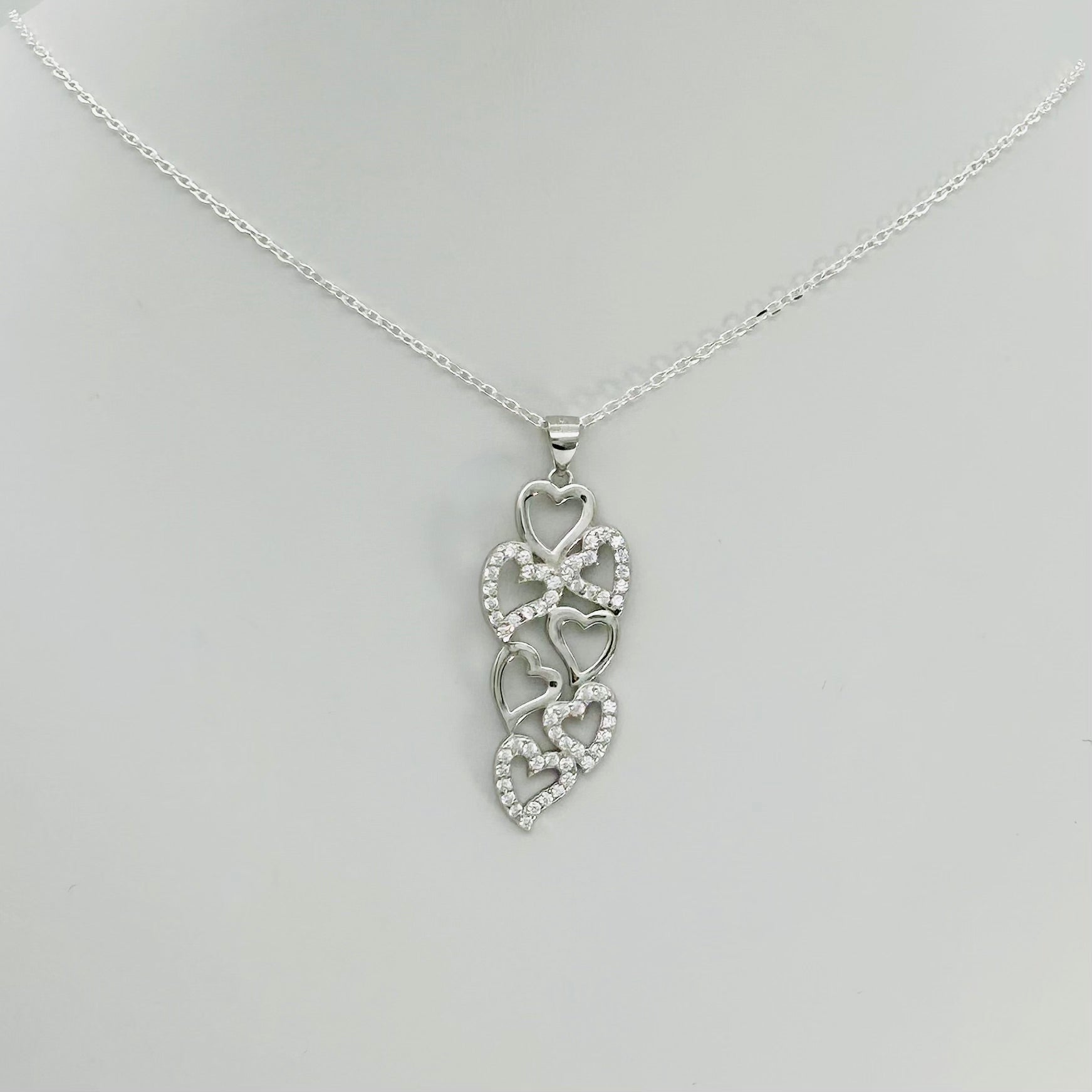Crafted from .925 sterling silver, this hearts necklace features brilliant cubic zirconia stones that capture and reflect light with exceptional clarity. The 18-inch length offers versatile styling for layering or wearing solo. Sterling silver's timeless appeal combined with the sparkle of cubic zirconia creates an elegant piece suitable for everyday wear or special occasions. Durable and lustrous, this necklace delivers sophisticated shine at an accessible price point.