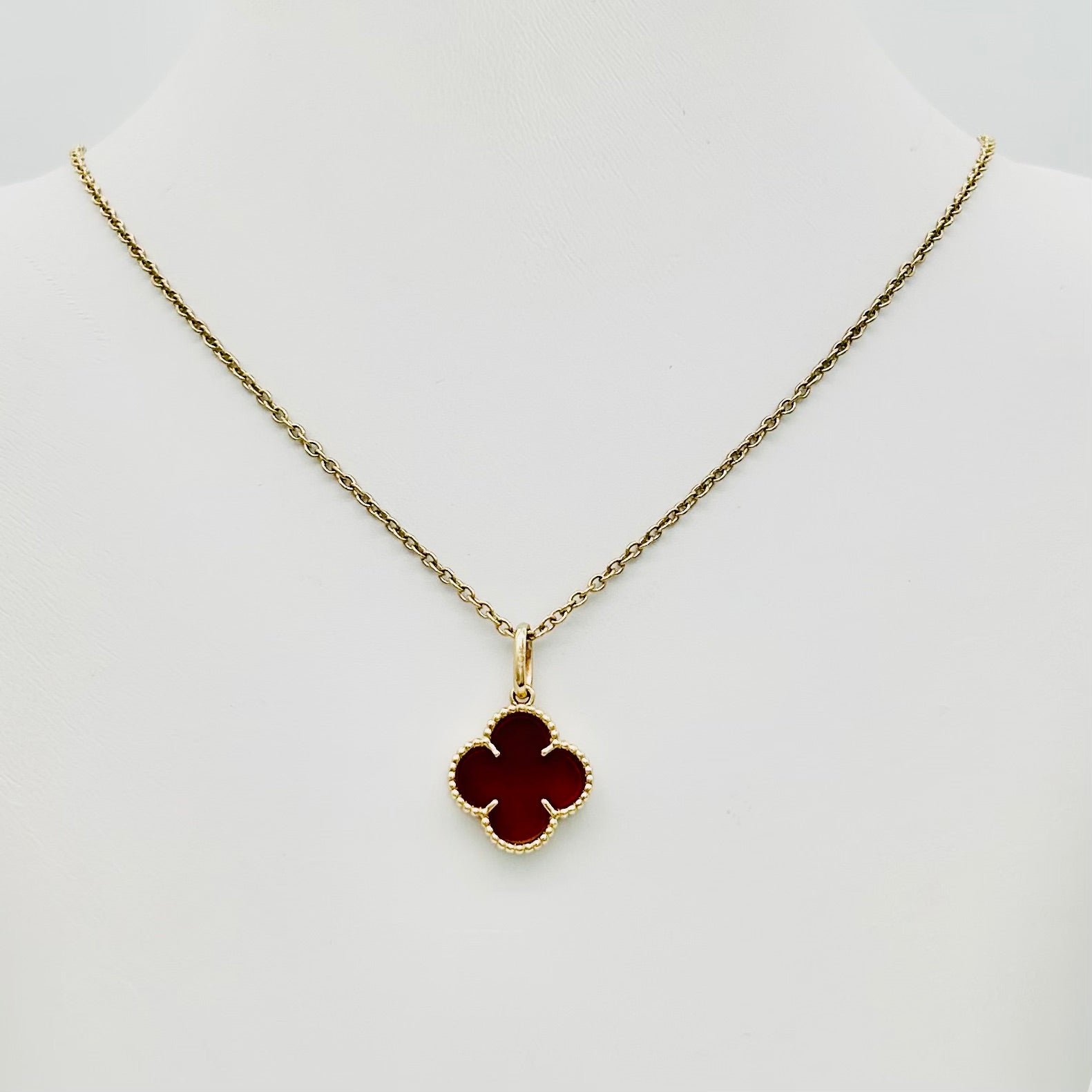 This 18-inch necklace features a delicate red clover pendant crafted from 10k gold and resin, combining durability with refined elegance. The use of 10k gold ensures lasting quality and a subtle warm hue, while the resin adds a unique, lightweight touch. Perfect for those seeking a sophisticated accessory that blends classic materials with modern design.