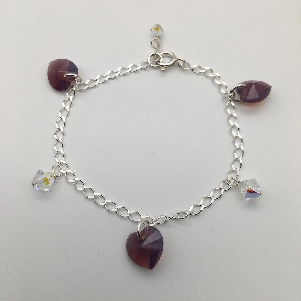 This elegant bracelet features genuine 925 Sterling Silver and sparkling Austrian Crystals, making it a high-quality piece of jewelry. The beautifully designed Purple Hearts add a touch of romance and femininity to any outfit. Made with care and attention to detail, it is a timeless accessory for any occasion.