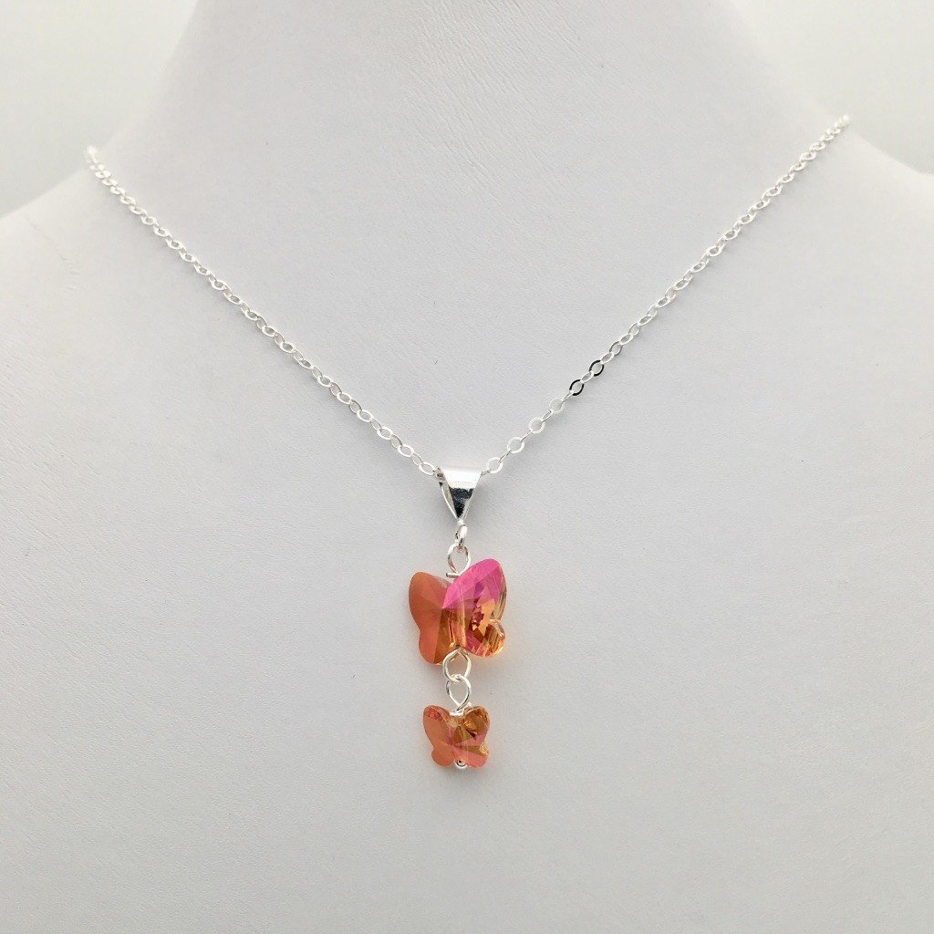 This Golden Butterflies Necklace is crafted with genuine 925 Sterling silver and shimmering Austrian Crystals. The 18" chain completes this elegant piece, highlighting its delicate beauty. Perfect for effortless sophistication and feminine charm.