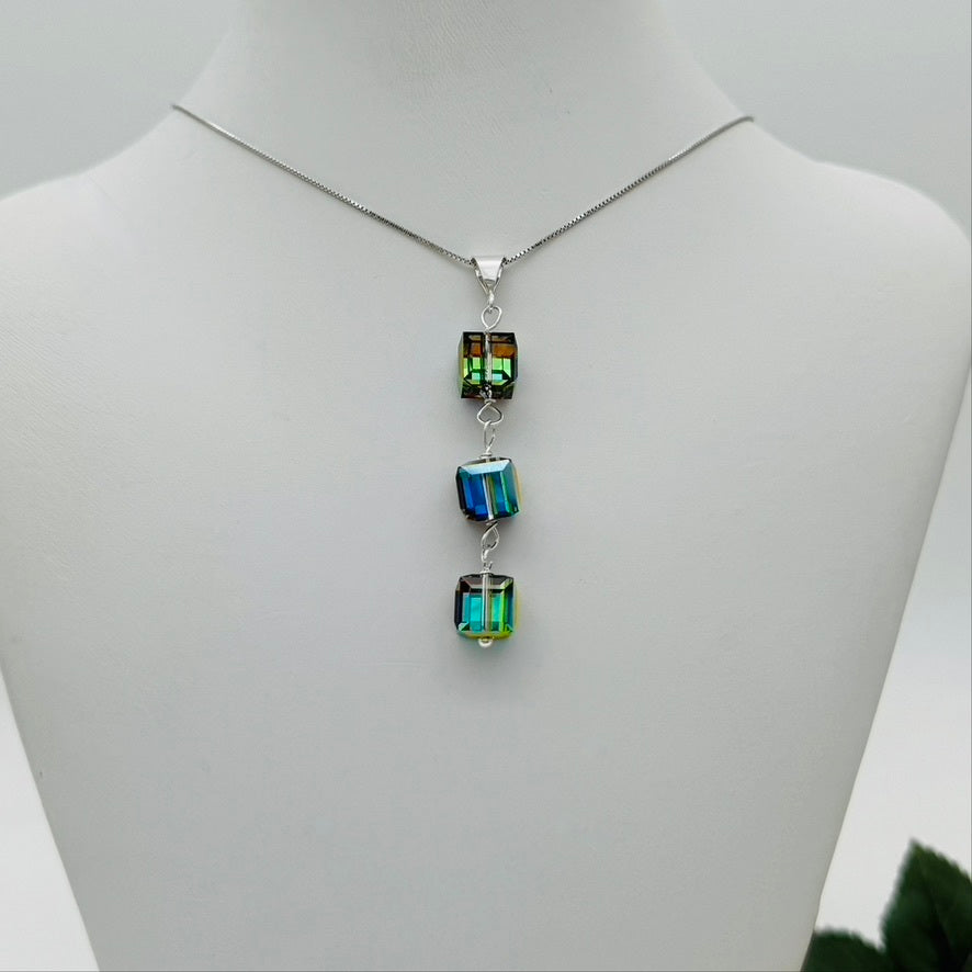 Expertly crafted with .925 sterling silver and studded with sparkling Austria Crystals, the C1384NL Rainbow Cubes Necklace adds a touch of elegance to any outfit. Its versatile 18" length makes it perfect for layering or wearing alone. Elevate your jewelry collection with this stunning piece.