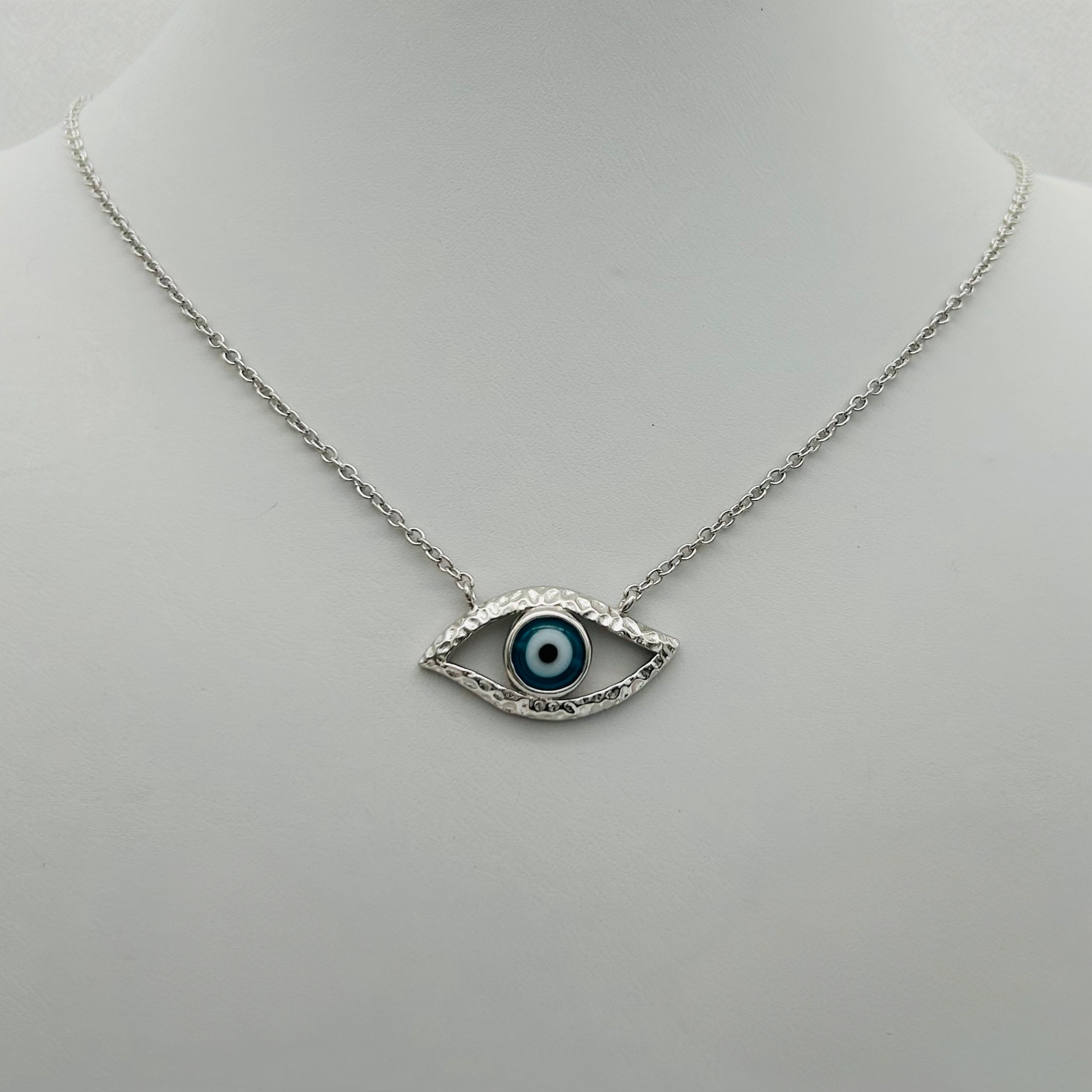 This C1447 Eye Necklace is perfect for adding a touch of elegance to any outfit. Crafted from .925 Sterling silver and accented with glass, this necklace exudes sophistication and is a stunning addition to any jewelry collection. Its 18-inch length is versatile and perfect for layering or wearing on its own. Elevate your style with this eye-catching necklace.
