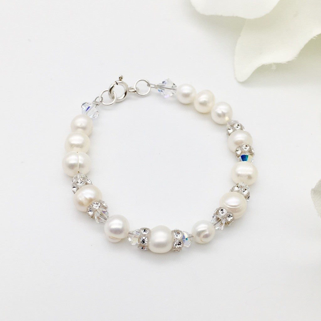 This children's bracelet is made of high-quality 925 sterling silver and adorned with white fresh water pearls. The 6" size is perfect for little wrists. A timeless piece that adds elegance and charm to any outfit. Crafted with precision and care, it's a durable and beautiful accessory that will last for years to come.