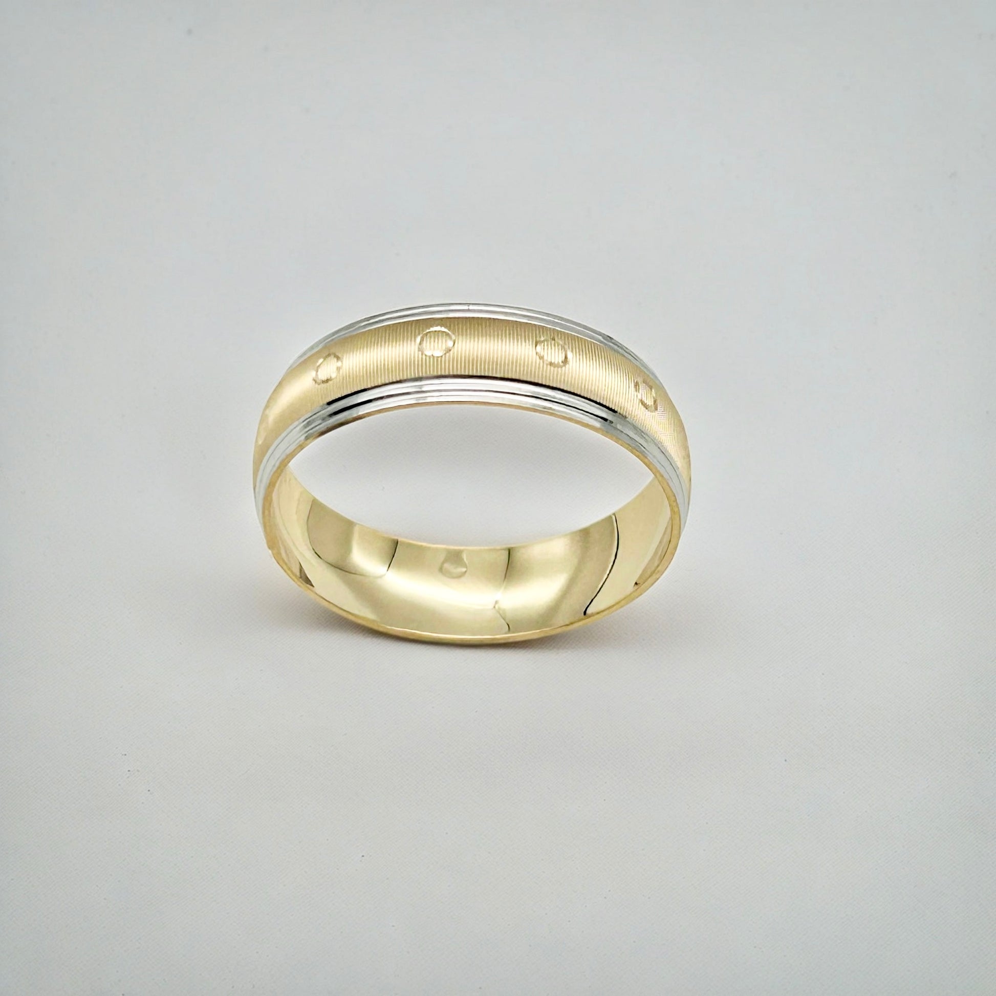 This 2-tone 14K gold wedding band features a sleek and timeless design, perfect for honoring your special day. Made with high-quality materials, it boasts a 6mm width for a comfortable fit. Elevate your wedding attire with this sophisticated and elegant piece.