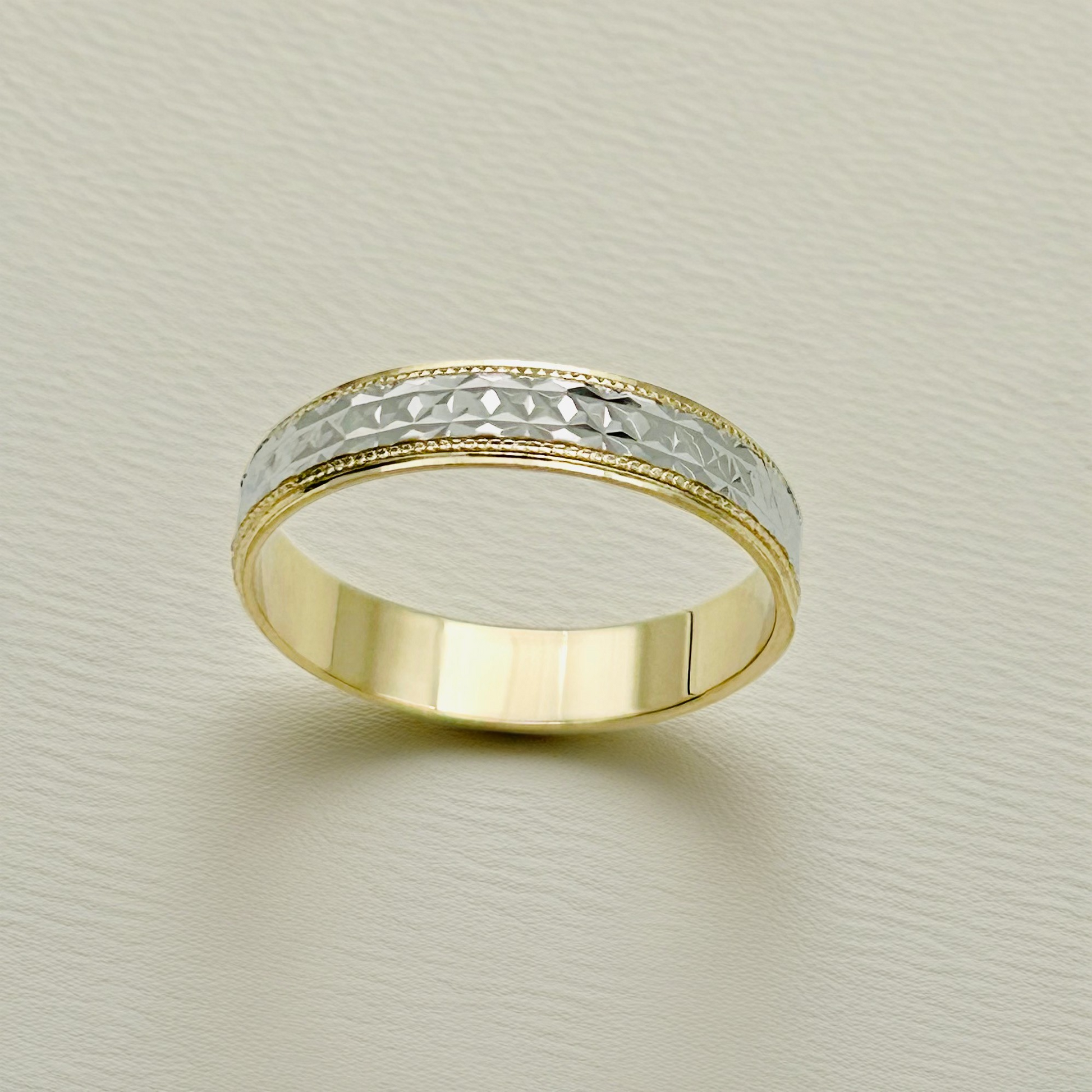 Crafted from high quality 14K gold, this elegant and timeless wedding band features a unique 2 tone design. Its luxurious composition exudes a sense of sophistication and durability, making it the perfect symbol of everlasting love. Enhance your special day with the beauty and brilliance of the G411 14K Gold Wedding band #7.