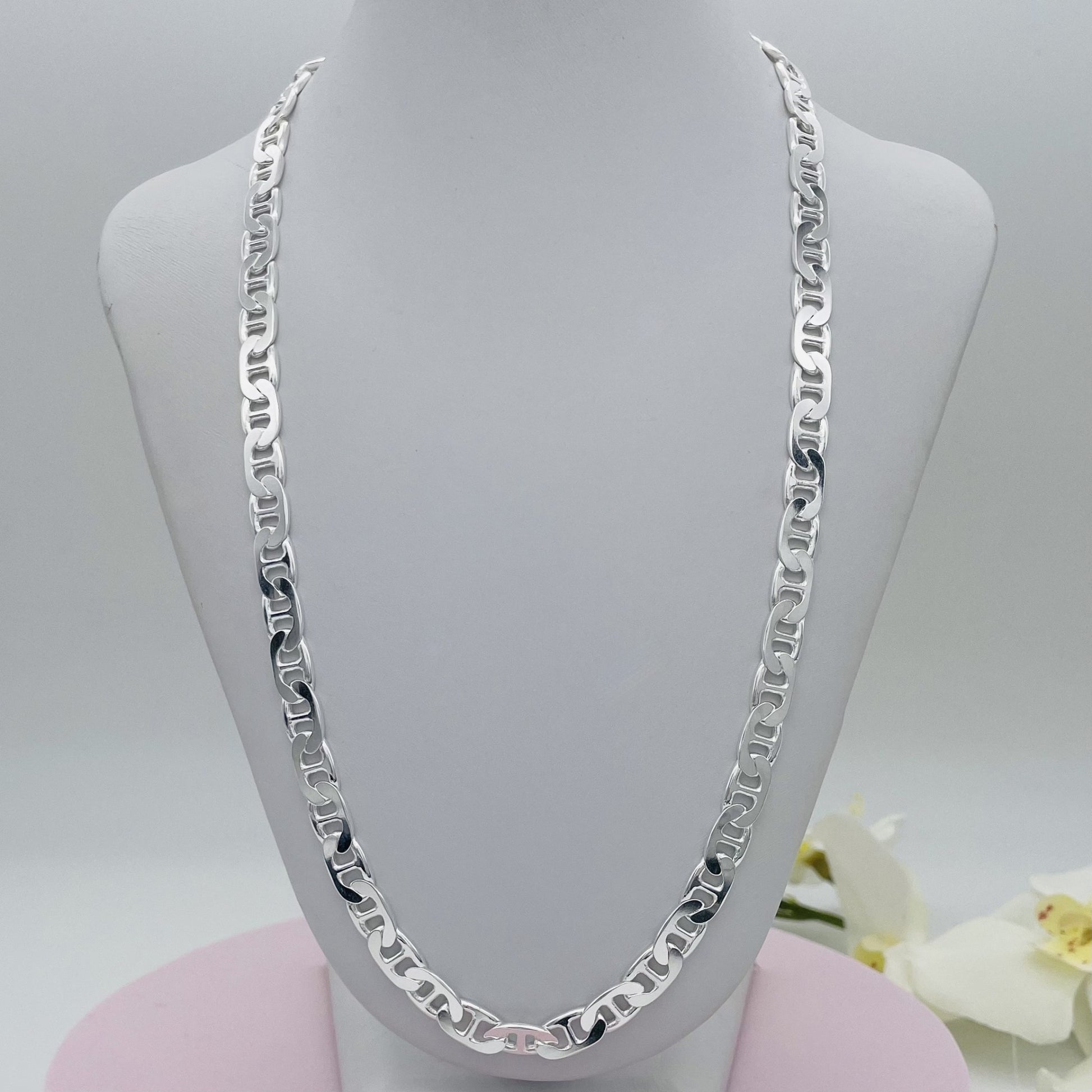 This S1680CH Flat Marina Chain is made from genuine 925 sterling silver, providing durability and a sleek appearance. At 5.7mm thick and 24 inches long, this chain is perfect for adding a touch of elegance to any outfit. Make a statement with this high-quality piece.