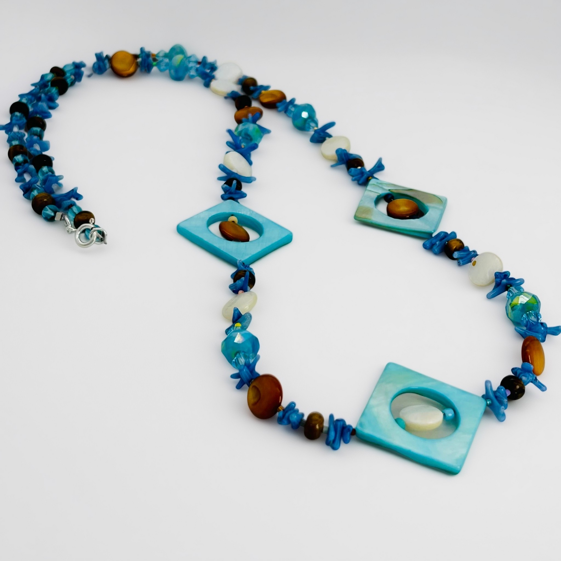 Expertly crafted from .925 sterling silver, this 30" blue necklace features an elegant combination of mother of pearl, tiger eye, and dyed blue bamboo coral. Accented with sparkling crystals, this sophisticated piece offers versatile styling options while showcasing premium natural materials and expert silversmithing techniques.