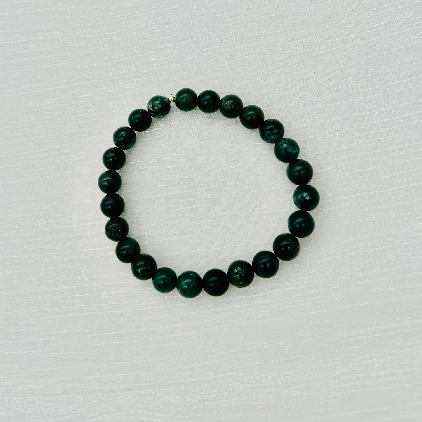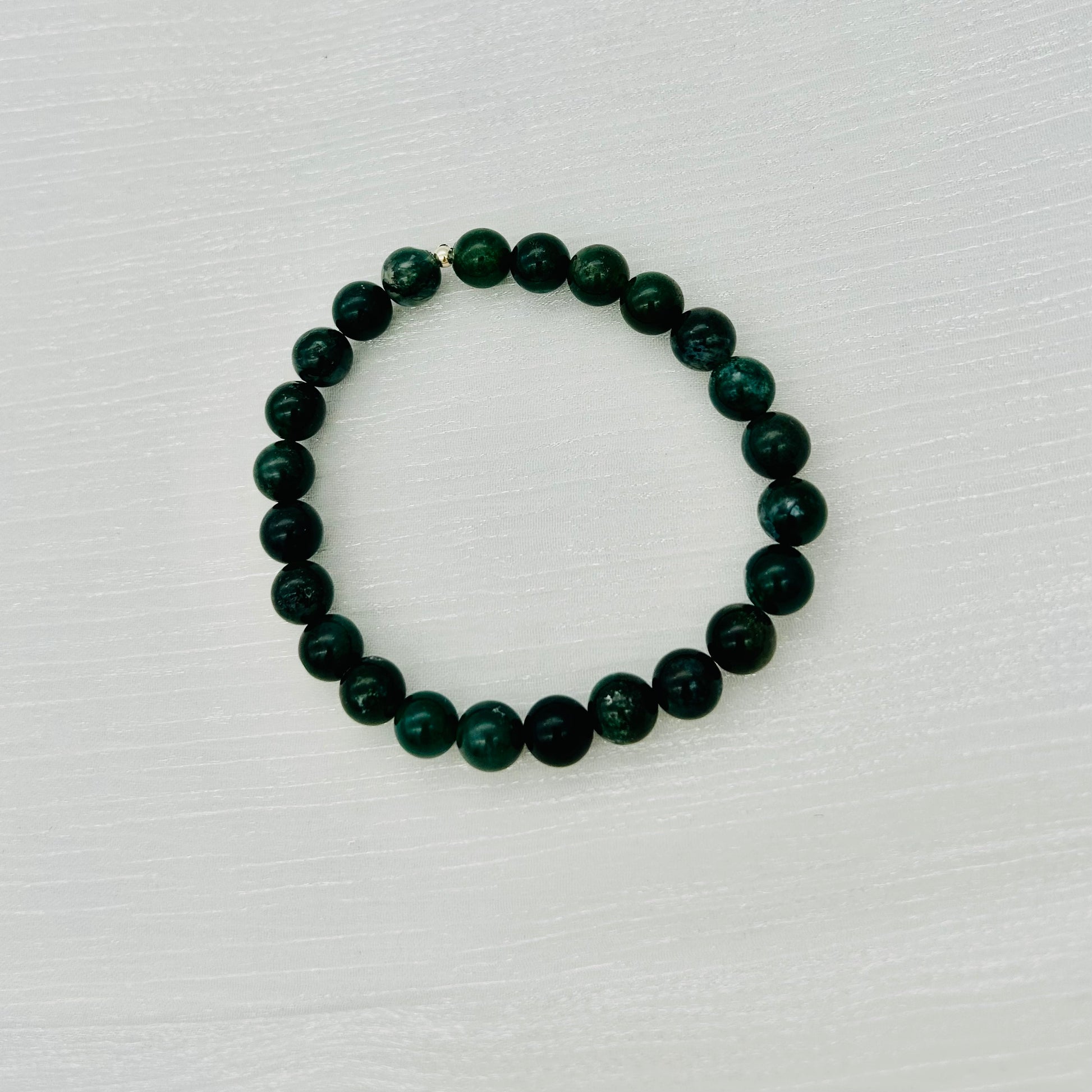 This Moss Agate Bracelet features beautiful natural stones that are believed to promote growth, abundance, and healing. Crafted with quality materials, this 7.5" bracelet is a versatile accessory that adds a touch of elegance to any outfit. Enhance your well-being and style with this stunning bracelet.