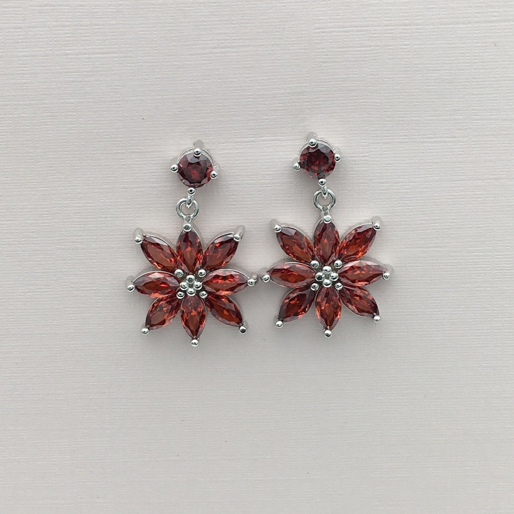 These Z1289 Poinsettia Flower Earrings are crafted from 925 Sterling Silver and feature a stunning garnet-colored cubic zirconia stone. Made with high-quality materials, these earrings provide a touch of elegance to any outfit. The perfect combination of style and sophistication.