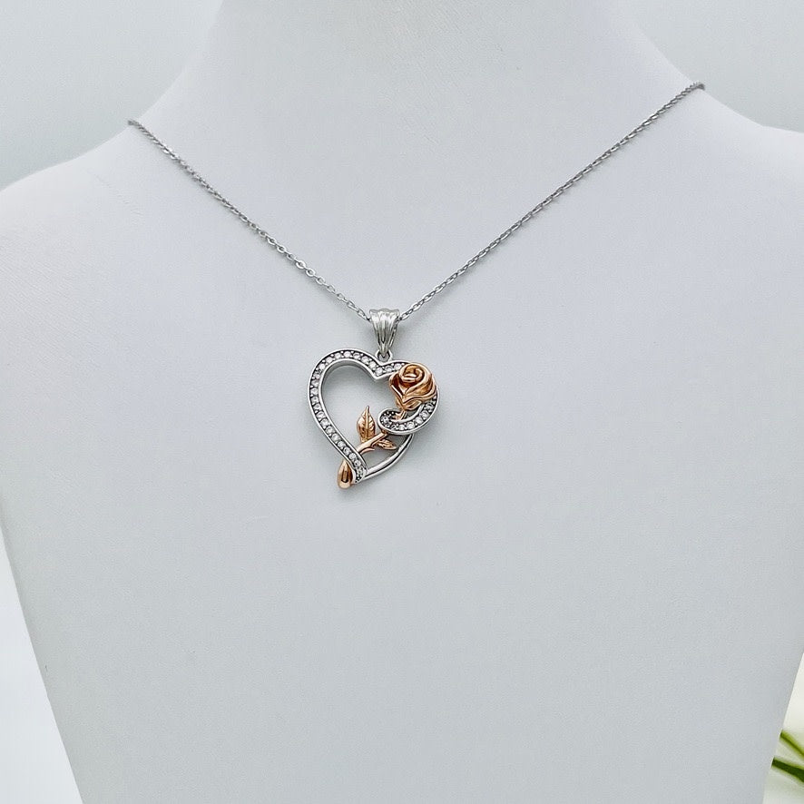 Crafted with expert precision, the Z1506NL Heart With Rose Necklace is made from high quality .925 sterling silver and sparkling cubic zirconia. Exquisitely designed, this necklace adds a touch of elegance to any outfit while also showcasing your love through its delicate heart and rose pendant. The perfect blend of beauty and sentiment.