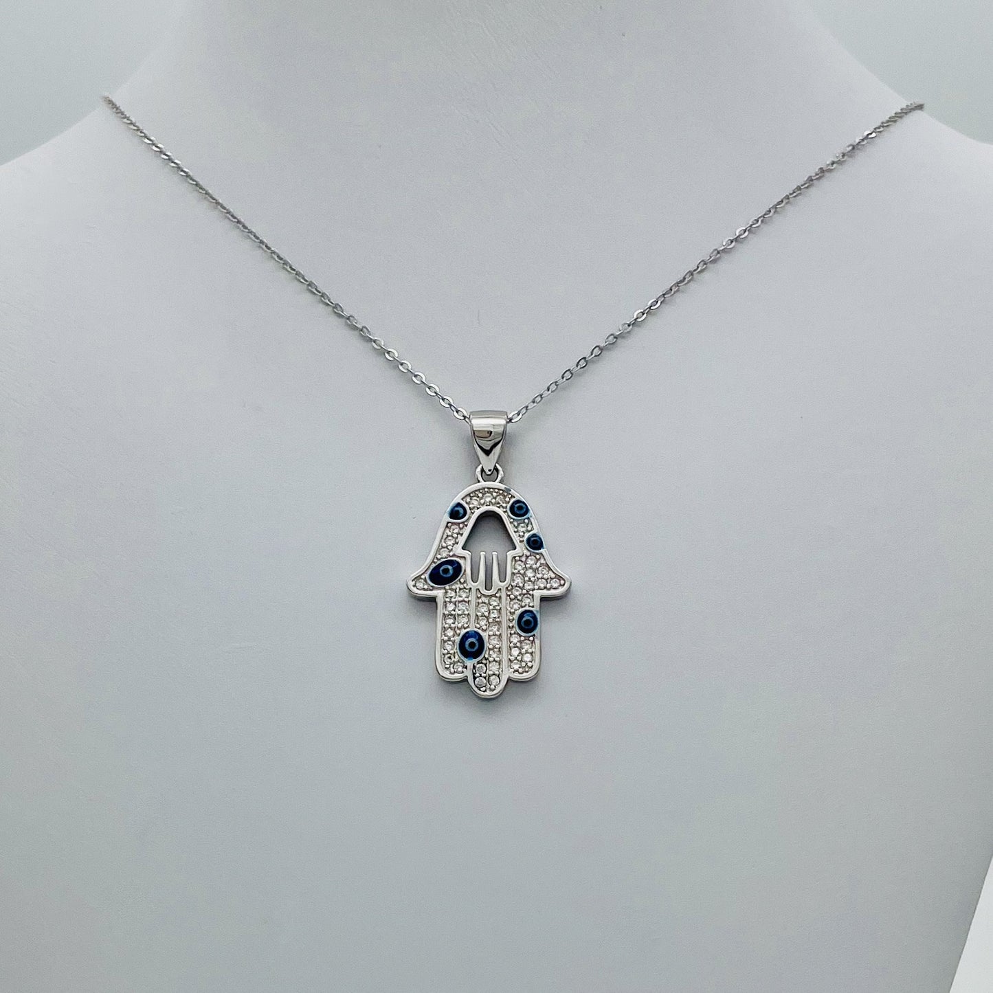 Made with genuine 925 sterling silver and sparkling cubic zirconia, the Z1510NL Fatima Hand With Eyes Hamsa Necklace is a stunning accessory that adds a touch of elegance to any outfit. Enjoy the benefits of quality materials and eye-catching design with this 18" necklace.