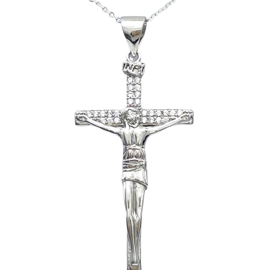 Expertly crafted from genuine 925 sterling silver, this Z1574P crucifix pendant boasts a stunning design with a size of 50mm x 25mm. Adorned with sparkling cubic zirconia, it offers a sophisticated and elegant touch to any outfit. Experience the ultimate blend of quality and style with this pendant.