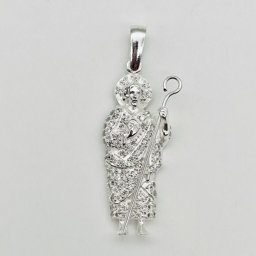 This Z1642P San Judas Pendant is expertly crafted from genuine 925 sterling silver and adorned with cubic zirconia stones. With its sleek 46mm x 15mm design, it is a sophisticated and stylish addition to any jewelry collection. Elevate any outfit with this high-quality pendant.