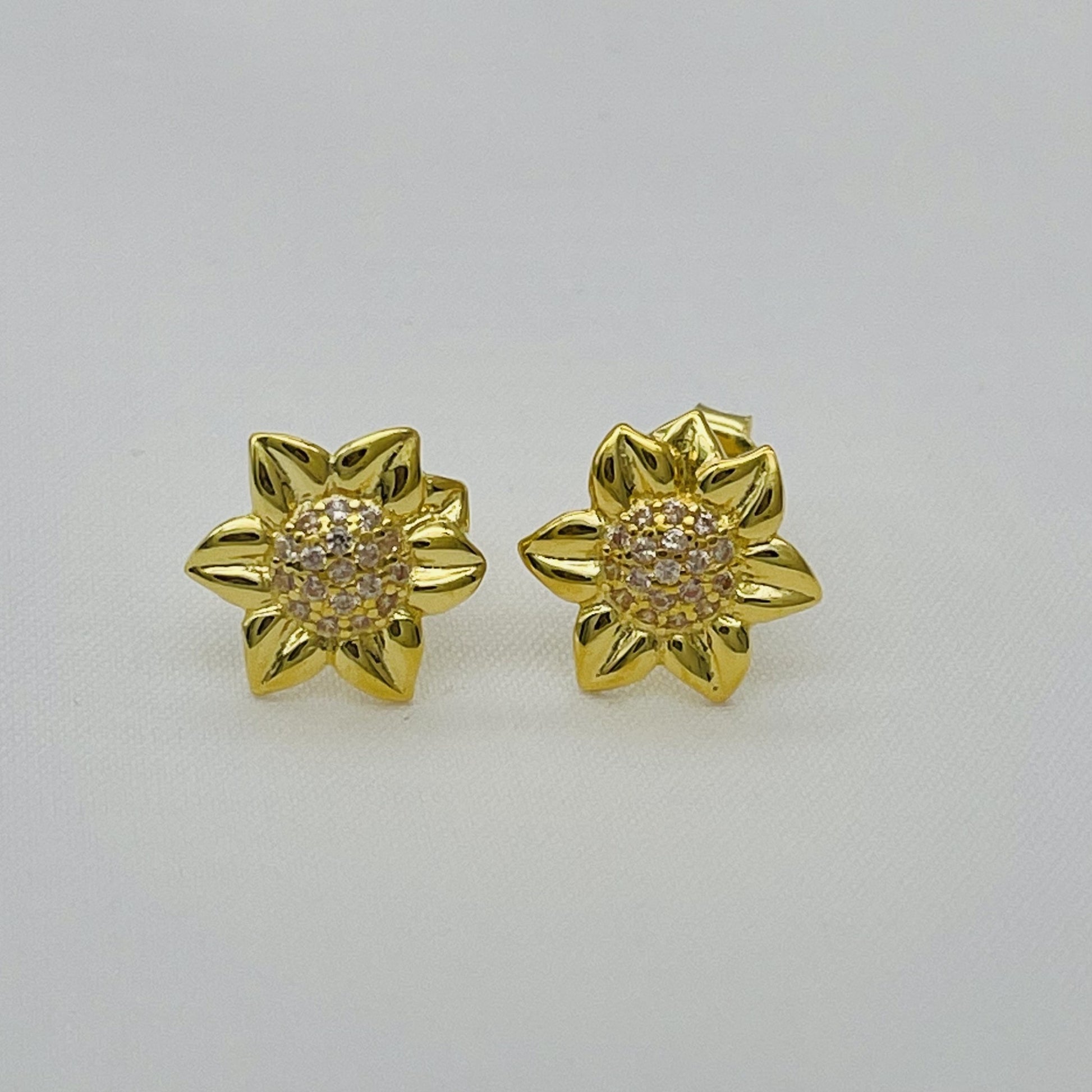 These Z1671ER Gold Plated Sunflower Earrings are crafted from high-quality gold plated genuine 925 sterling silver and adorned with sparkling cubic zirconia. Perfect for adding a touch of elegance and sophistication to any outfit. Enjoy the beautiful sunflower design and the durability of genuine silver.