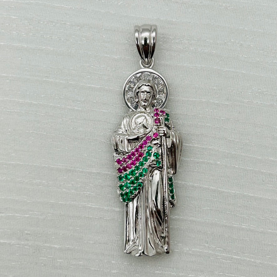 The Z1821 San Judas Pendant is a stunning piece of jewelry, crafted from genuine 925 sterling silver and cubic zirconia. Measuring 46mmX19mm, the pendant is the perfect size to make a subtle, stylish statement.
